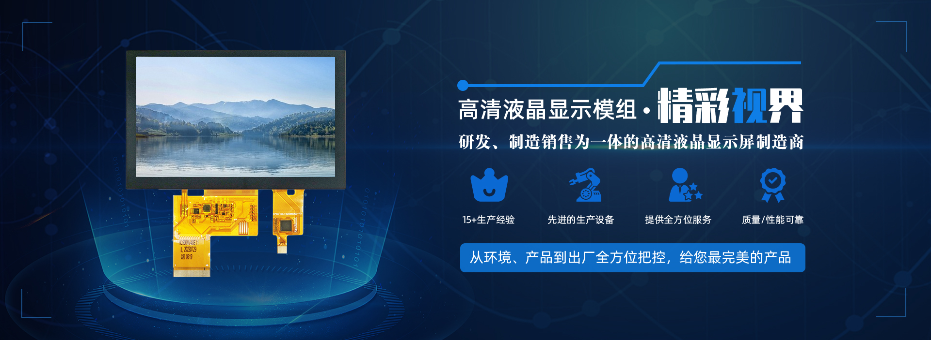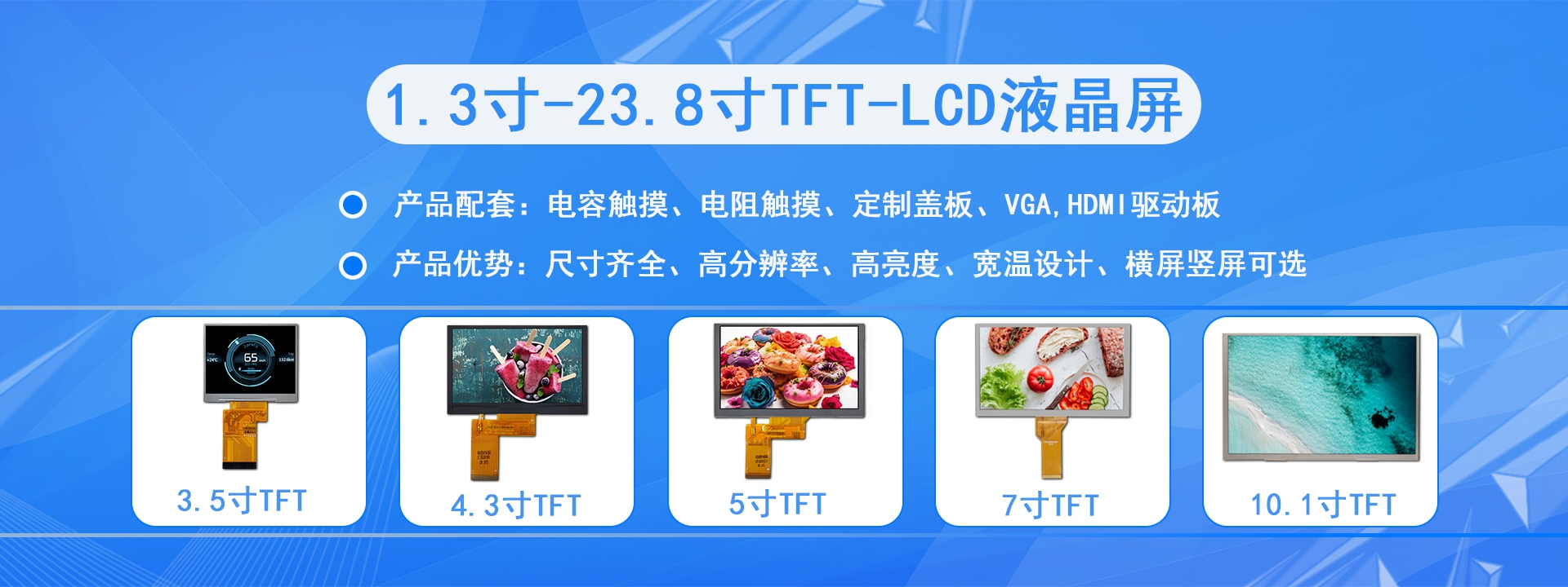 公司主營產(chǎn)品為0.96寸~27寸液晶屏及相關(guān)配套產(chǎn)品,主力尺寸為3.5”、4.3”、5”、7”、8”、9”、10.1”、11.6”、13.3”、15.6”。綜合月生產(chǎn)產(chǎn)量約500-800K。我們的產(chǎn)品超過60%為按客戶需求定制的產(chǎn)品,多年的行業(yè)經(jīng)驗讓我們可以根據(jù)客戶的產(chǎn)品應(yīng)用提供建設(shè)性的定制建議。